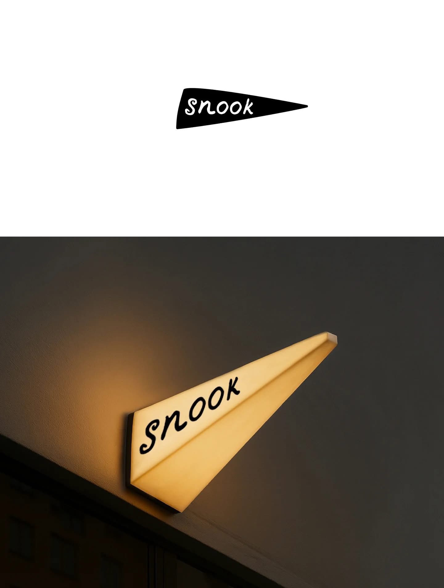 Nhìn vào thiết kế logo của Snook, chúng ta thấy ngay sự tinh tế trong việc trừu tượng hóa hình ảnh. Logo là một hình tam giác nhọn kéo dài, đây chính là sự cách điệu hoàn hảo của chiếc mỏ kền kền. Nó sắc sảo, định hướng chuyển động (hướng về phía trước hoặc hướng về phía quầy bánh) và tạo cảm giác nhanh, dứt khoát. Đồng thời, hình dáng này cũng gợi liên tưởng đến phần đuôi của một chiếc bánh mì baguette vừa mới nướng. Trái ngược với khung viền sắc nhọn, chữ "Snook" bên trong lại sử dụng font chữ viết tay (handwritten) mềm mại, có chút nguệch ngoạc tự nhiên. Điều này đại diện cho sự thủ công, mềm xốp của bột bánh mì, cân bằng lại sự "nguy hiểm" của chiếc mỏ kền kền.