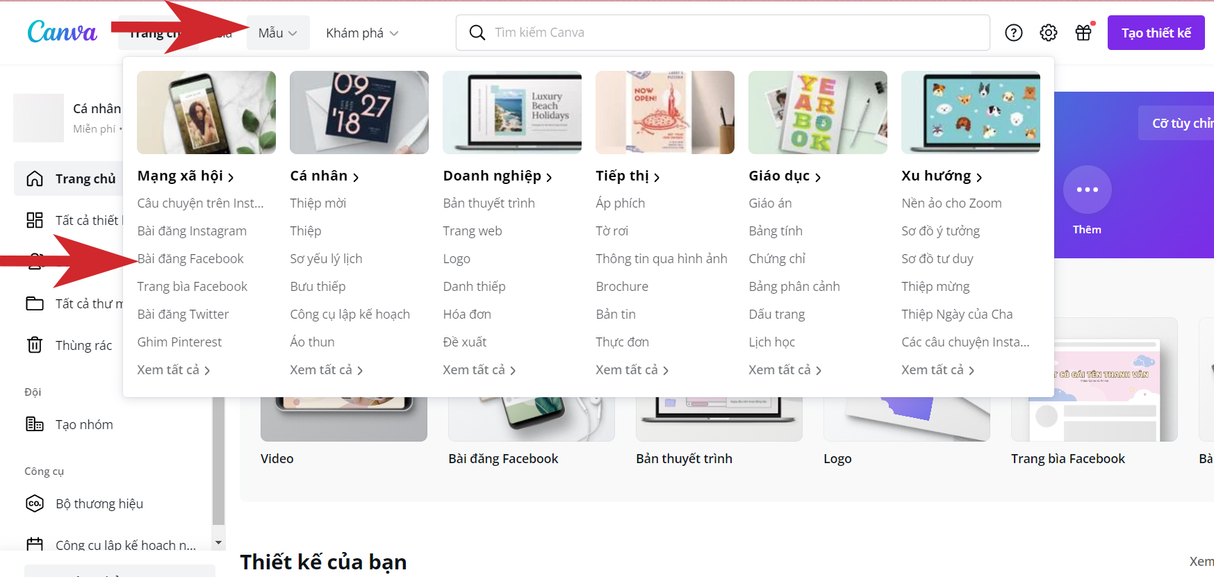- Tại thanh tìm kiếm hoặc mục "Tạo thiết kế," gõ loại hình bạn muốn làm (ví dụ: Bài đăng Facebook, Logo, Sơ yếu lý lịch). Canva sẽ tự động tạo khung canvas với kích thước chuẩn.