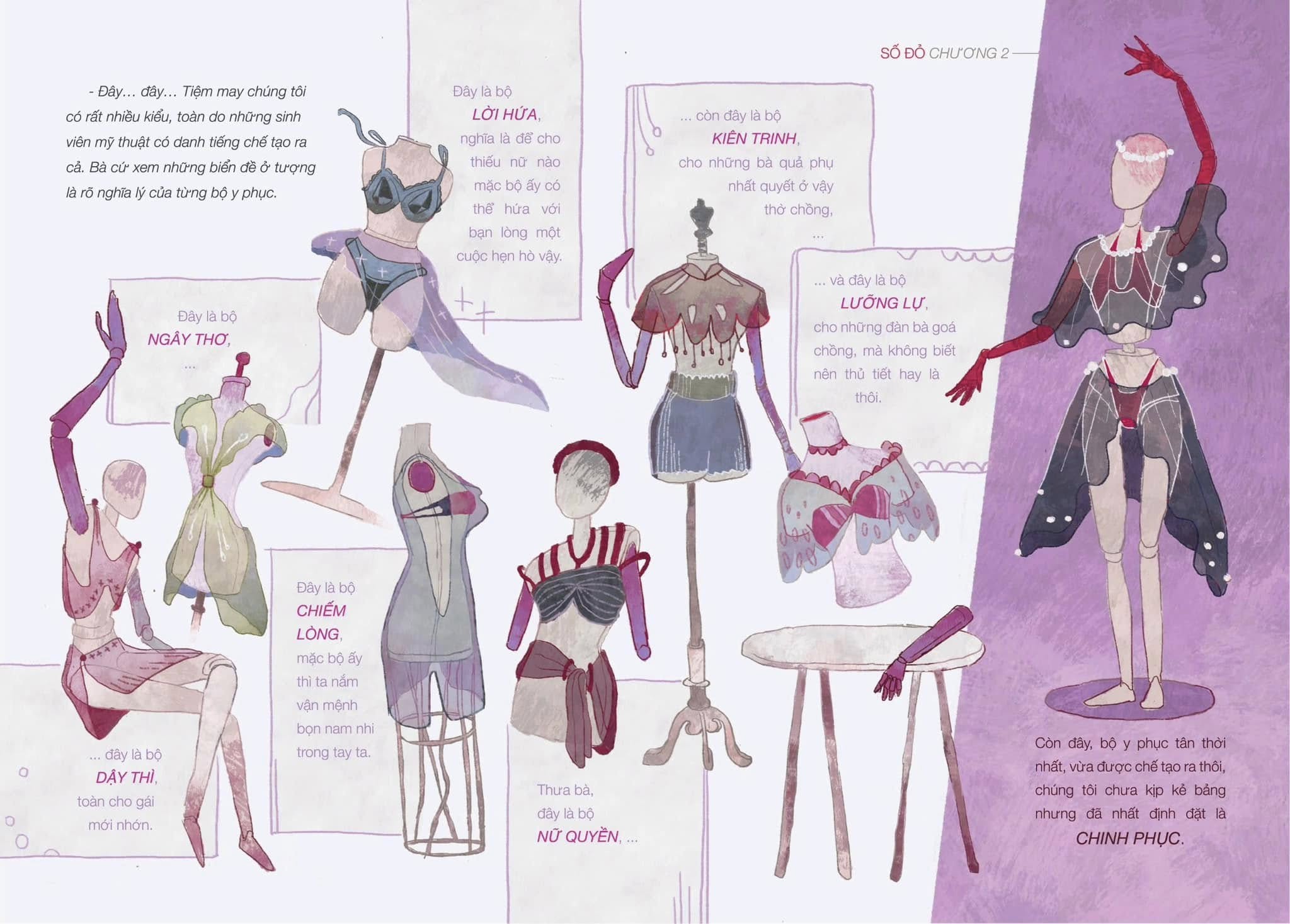 Dưới nét vẽ của Đức Tín, "Số Đỏ" không còn là những trang sách đen trắng khô khan. Các tranh minh họa trong đồ án đều đắm chìm tông màu đỏ, tím, hồng "hơi sến" để làm nổi bật cảm giác châm biếm mà hài hước của truyện.