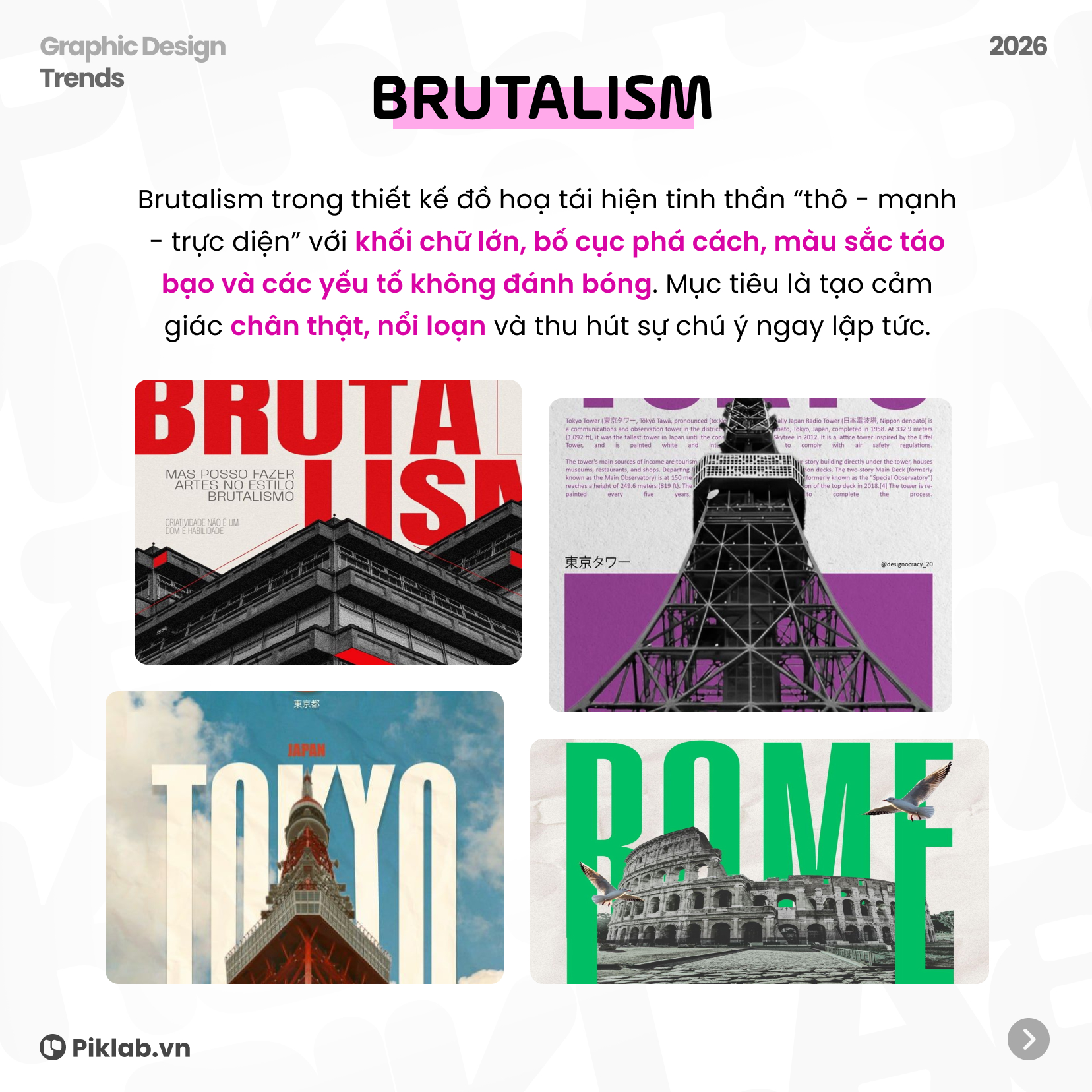 Trong thiết kế đồ họa tái hiện tinh thần “thô - mạnh - trực diện”. Lấy cảm hứng từ kiến trúc bê tông thô sơ, phong cách này đi ngược lại hoàn toàn với sự bóng bẩy và hoàn hảo.