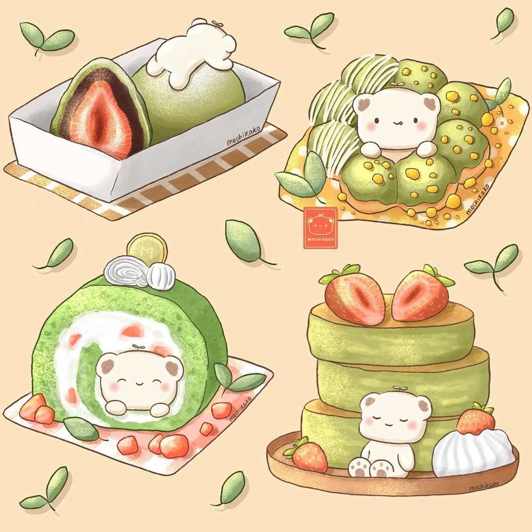 Vẫn là nét vẽ mềm mại, bảng màu pastel nhẹ nhàng quen thuộc của Mochikako, nhưng điều khiến bộ ảnh này đặc biệt chính là sự khéo léo trong việc nhân hóa đồ ăn - vừa giữ trọn cá tính của nhân vật, vừa khiến từng chiếc bánh như có linh hồn riêng.