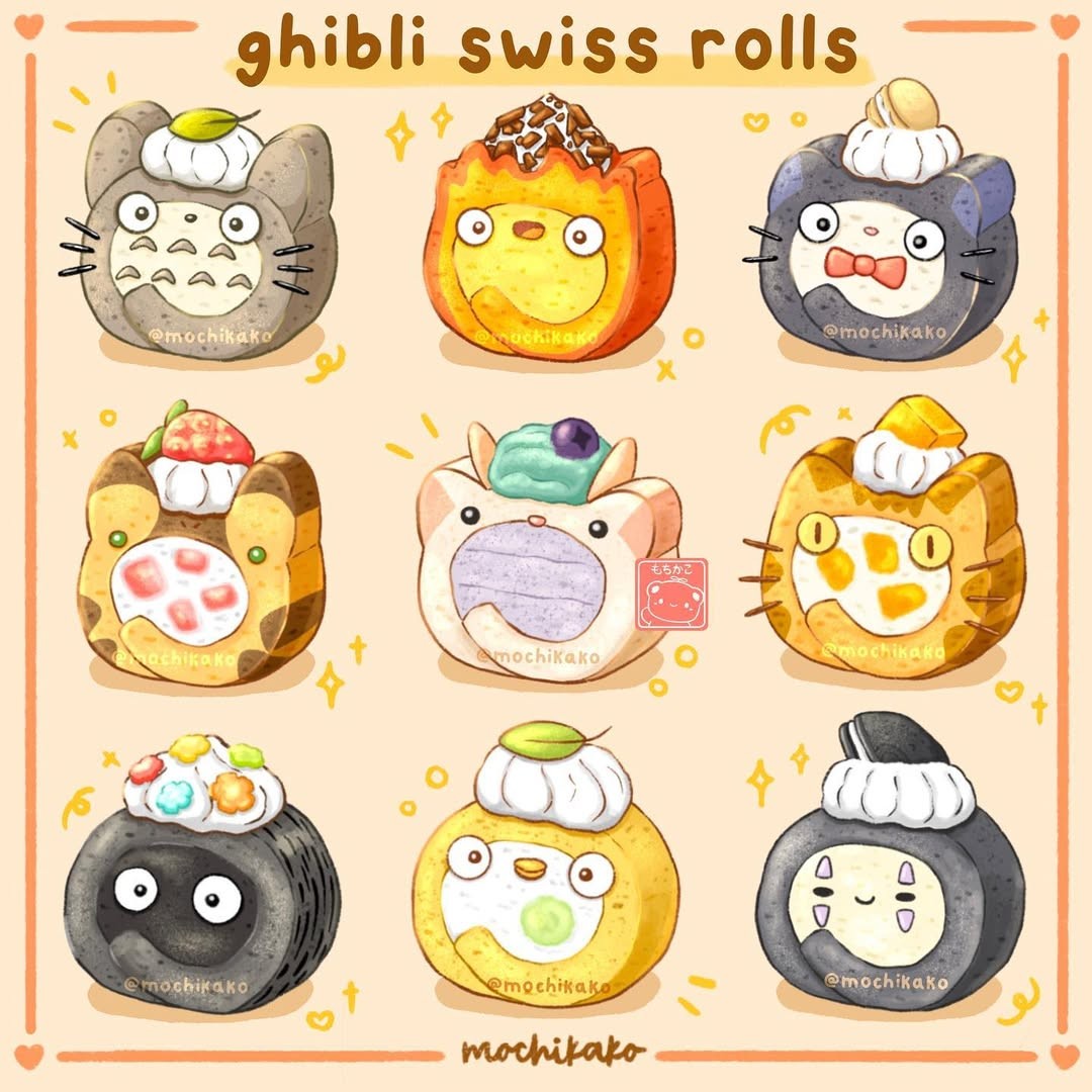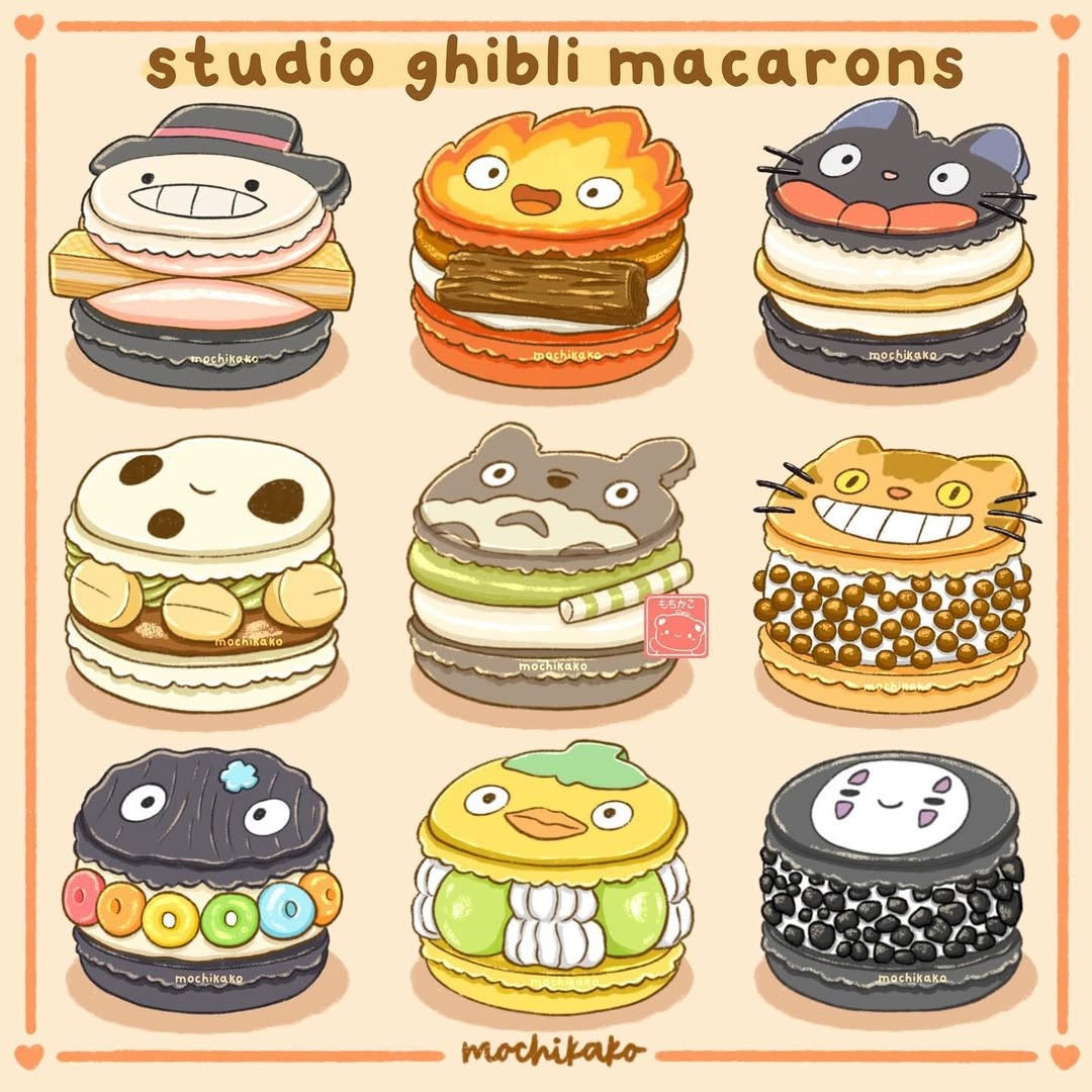 Nếu bạn từng say mê những nhân vật đáng yêu của Studio Ghibli như Calcifer, Totoro, hay chú mèo Jiji, thì chắc chắn sẽ tan chảy trước bộ tranh “sweet edition” của artist Mochikako. Bộ ảnh tái hiện lại các nhân vật kinh điển bằng phong cách food illustration siêu xinh – nơi những linh hồn lửa, mèo phép thuật hay bụi than bé nhỏ hóa thân thành cupcake, macaron, pudding hay bubble tea.