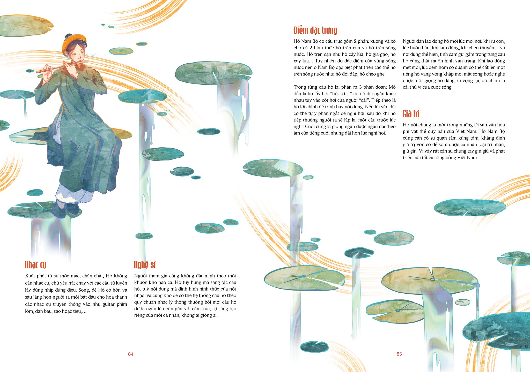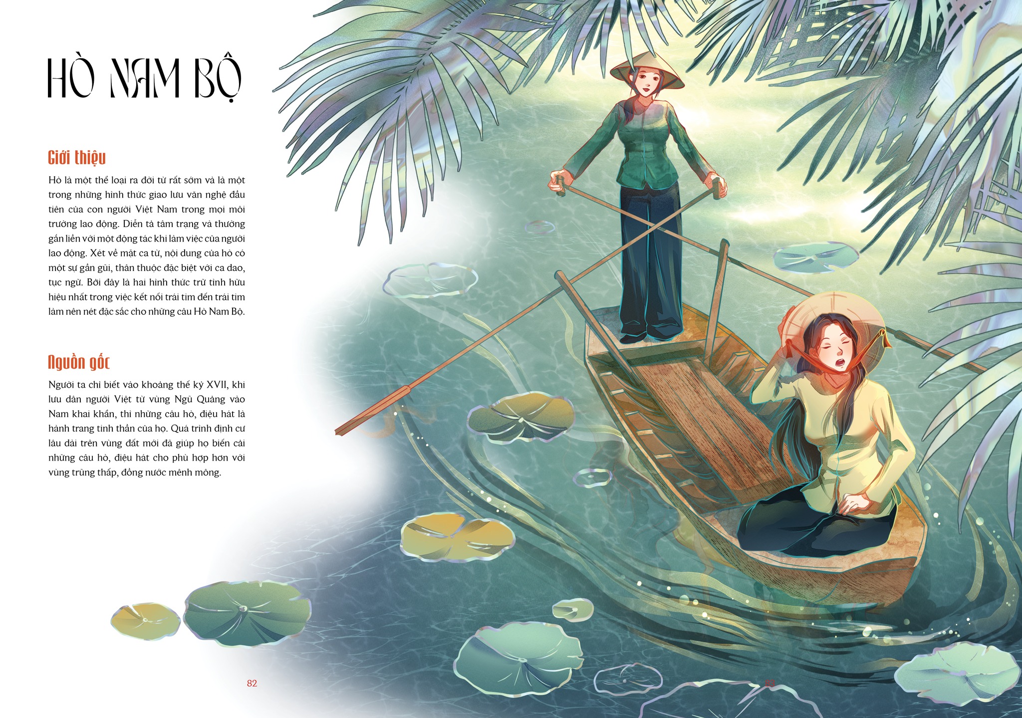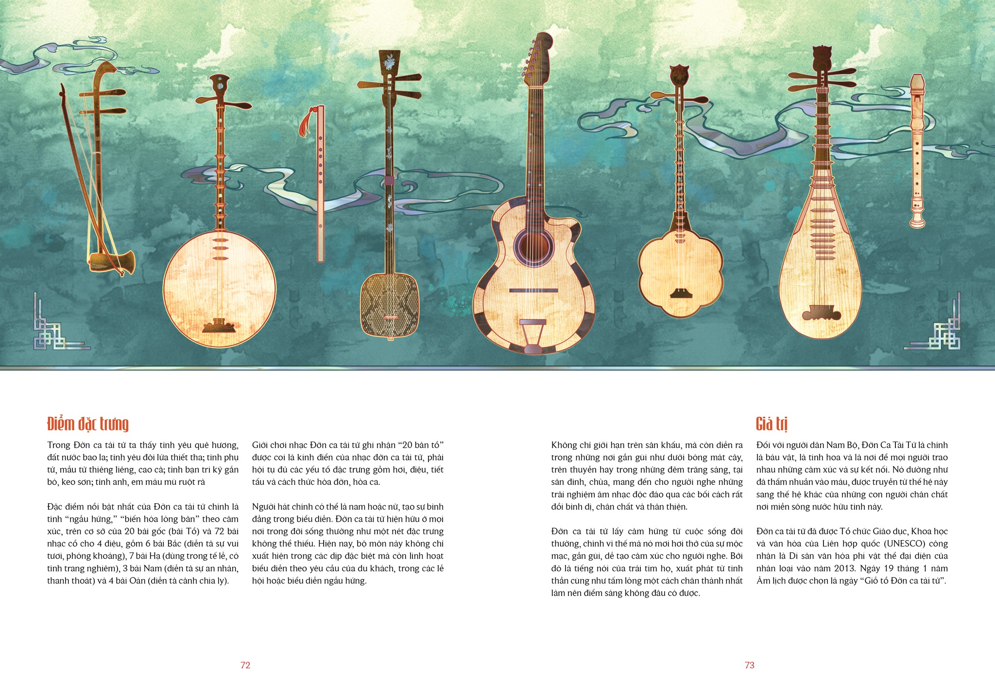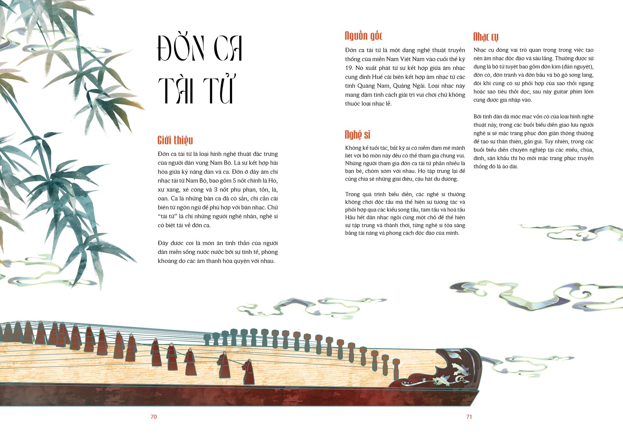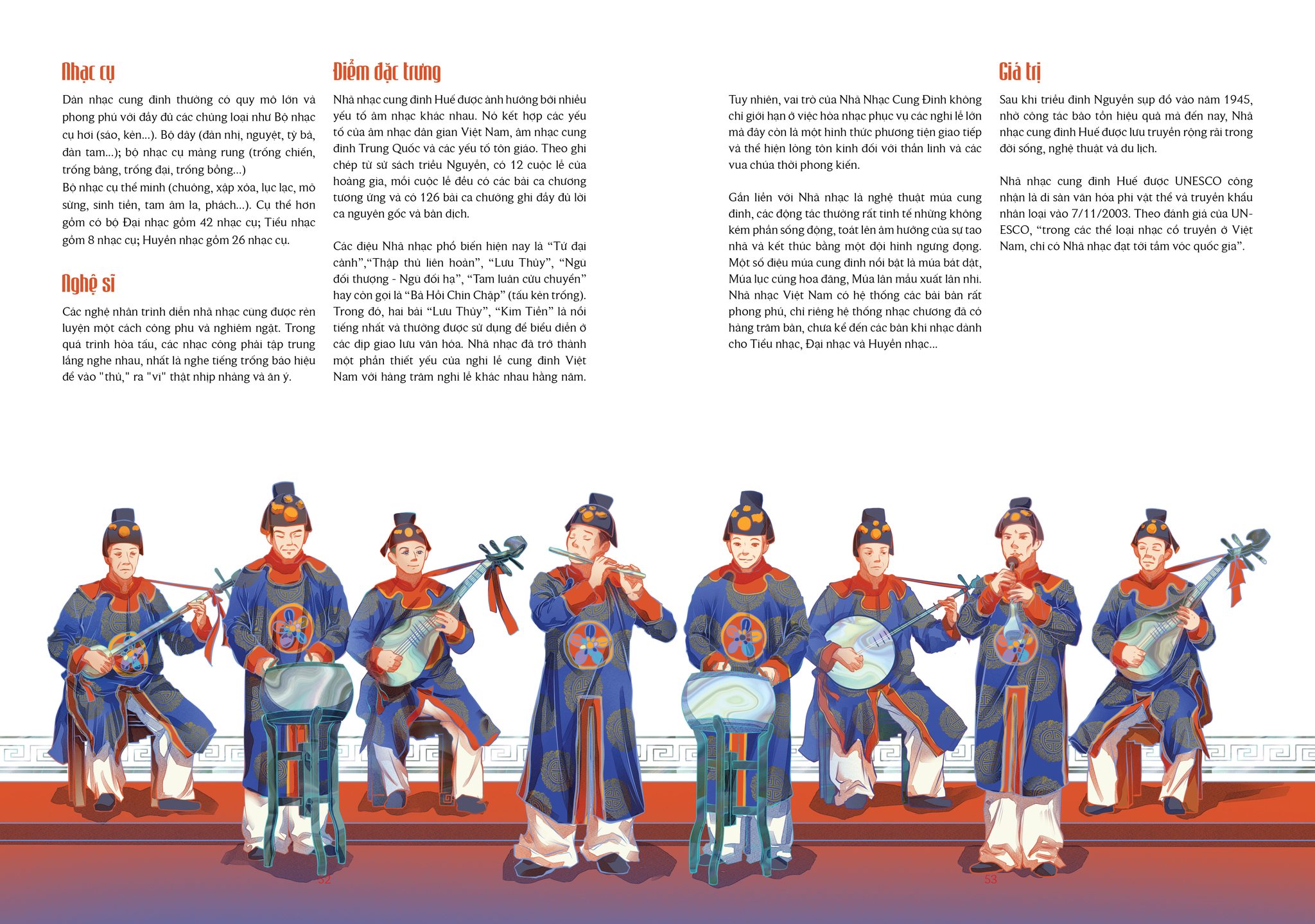 Sự sang trọng và quy chuẩn của Nhã Nhạc được thể hiện qua các tông màu tím, xanh lam và vàng kim. Những chiếc quạt xòe rộng, trang phục áo dài cung đình và nhạc cụ truyền thống được minh họa cực kỳ chi tiết, làm nổi bật đẳng cấp của loại hình nghệ thuật đã được UNESCO công nhận.