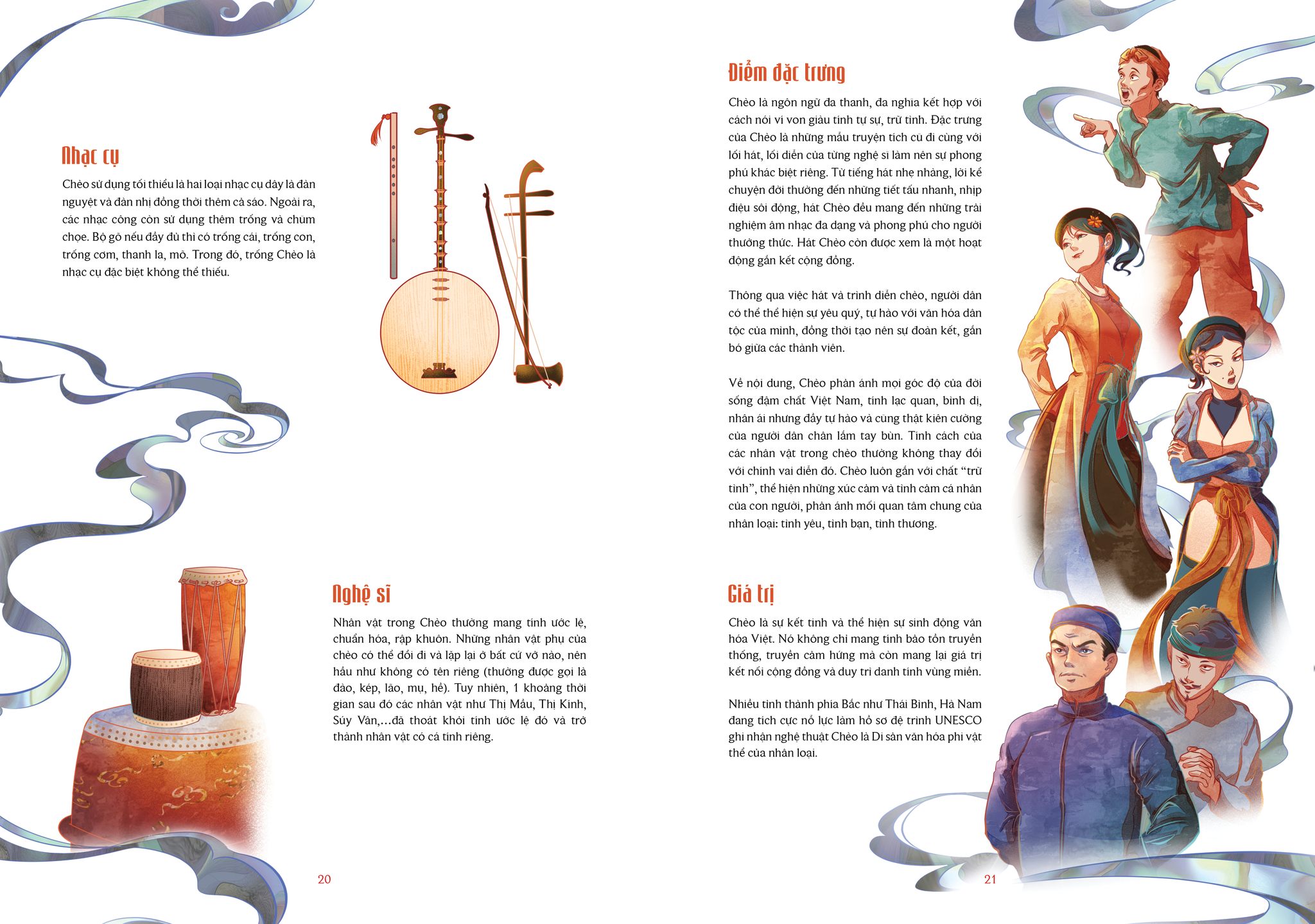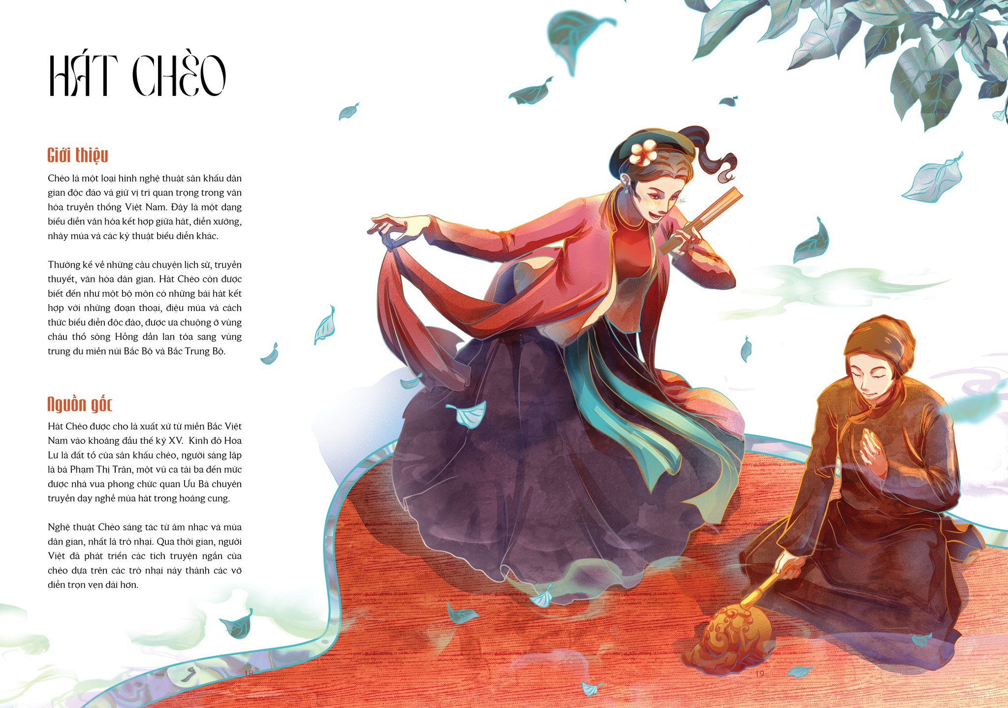 Nét vẽ mềm mại phác họa nên những nghệ nhân Chèo trong bộ trang phục mộc mạc nhưng đầy tinh tế. Đồ án giúp người xem hiểu rõ hơn về vai trò của bà Phạm Thị Trân – tổ nghề của sân khấu Chèo, đồng thời tôn vinh giá trị của các vở diễn thấm đẫm tính nhân văn.