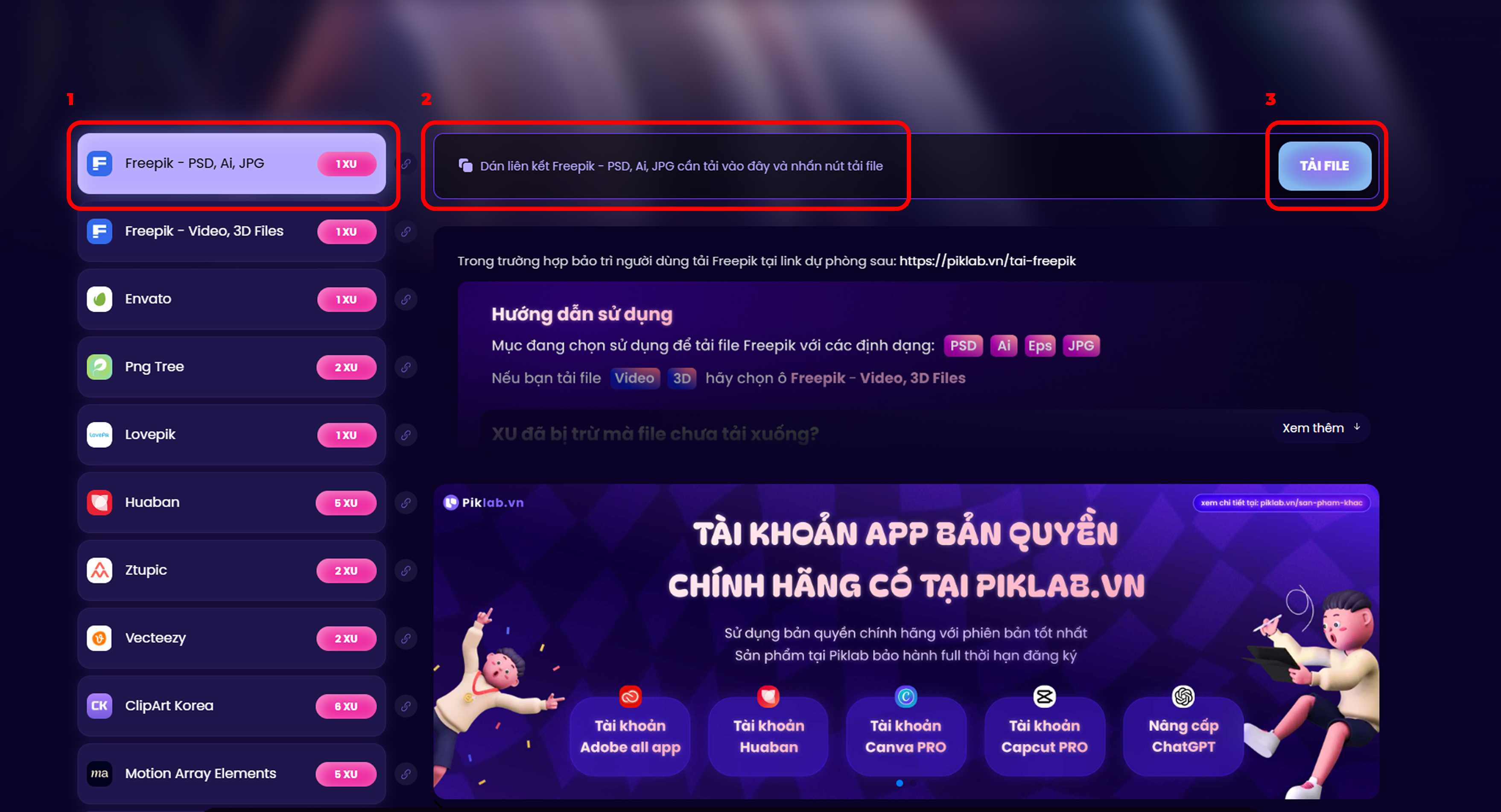 Người dùng chỉ cần dán link Freepik cần tải vào hệ thống, XU sẽ trừ và trả về file từ link mà người dùng dán trước đó).