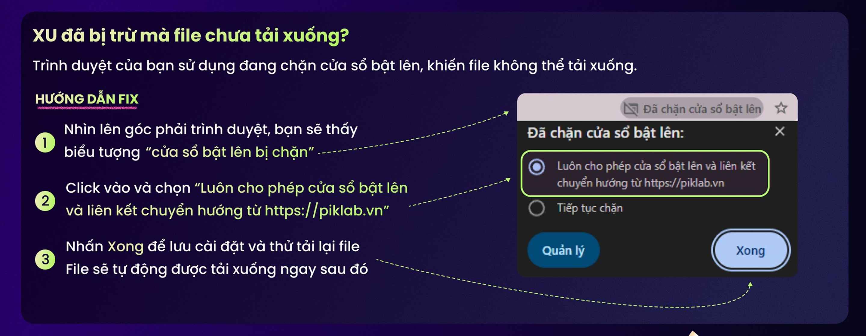 Để khắc phục người dùng chỉ cần vào phần thông báo ở góc phải trên trình duyệt, chọn "Luôn cho phép cửa sổ bật lên" cho đường dẫn từ website Piklab, sau đó thử tải lại sẽ sử dụng được bình thường."
