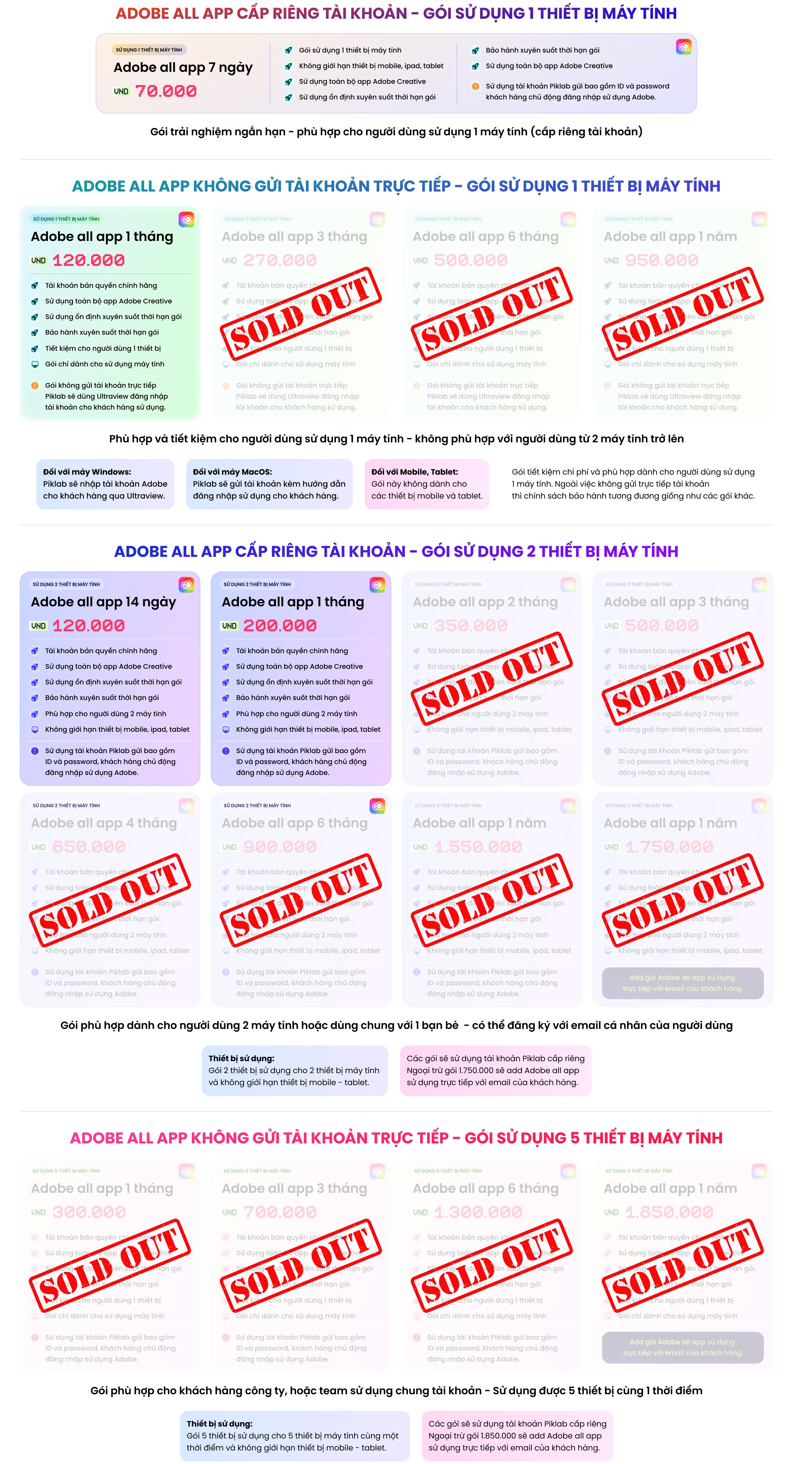 - Nhiều tài khoản Adobe giá rẻ trên thị trường là dạng add vào team dùng tạm 7–14 ngày. Giá rẻ nhưng thiếu ổn định, dễ hết hạn đột ngột, gây gián đoạn công việc, thậm chí mất file hoặc phải chờ bên bán xử lý. Nếu bên bán ngừng hỗ trợ, người dùng sẽ chịu thiệt hoàn toàn. → với công cụ làm việc quan trọng như Adobe, hãy đầu tư ngay từ đầu vào sản phẩm chính hãng, có chính sách bảo hành rõ ràng.
