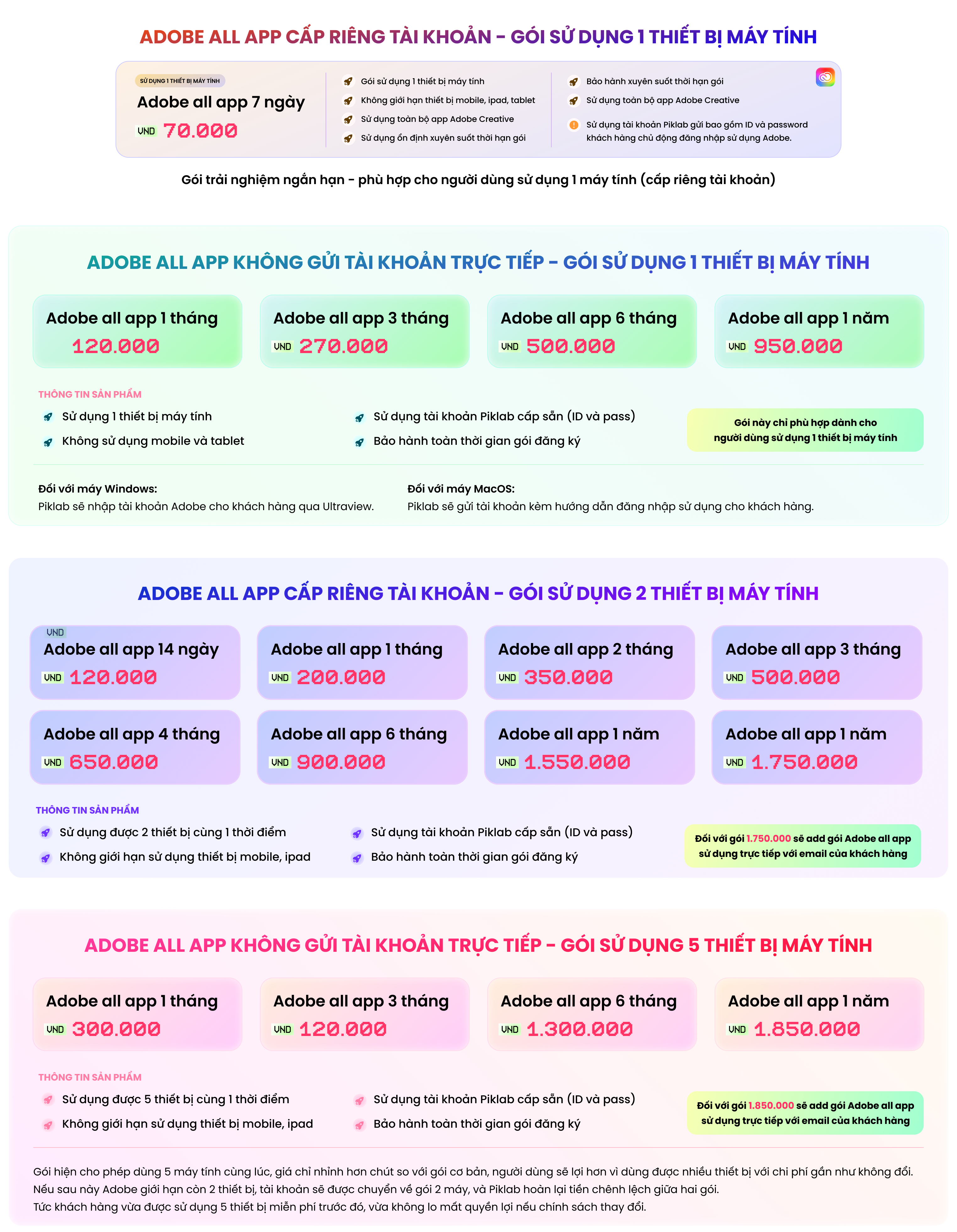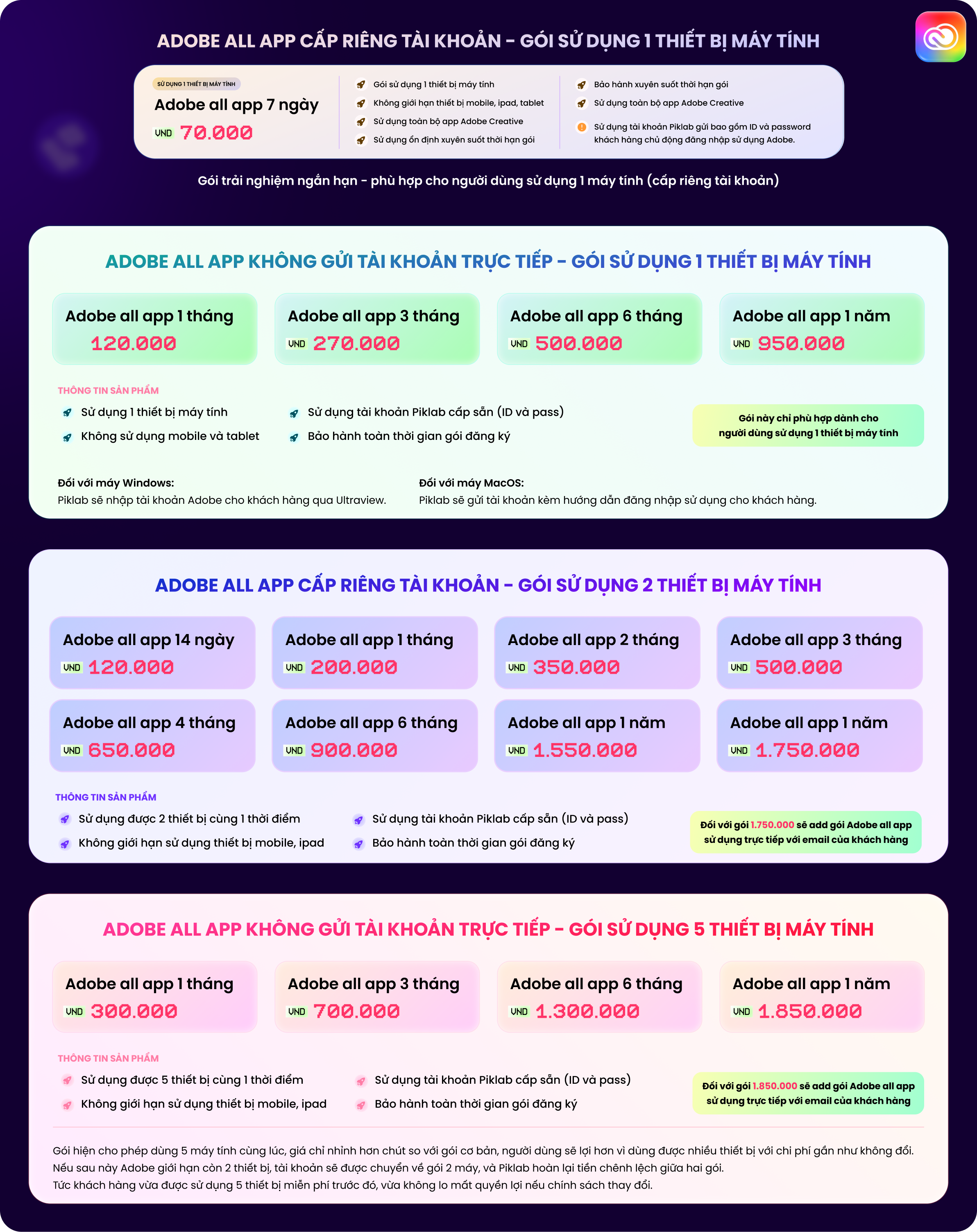 - Nếu sau này Adobe giới hạn còn 2 thiết bị, tài khoản sẽ được chuyển về gói 2 máy, và Piklab hoàn lại tiền chênh lệch giữa hai gói.
