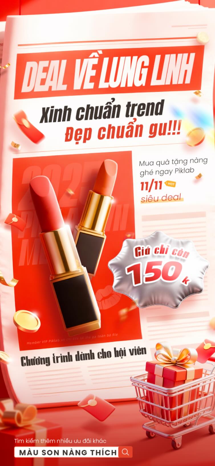 11.11 Lipstick Sale Poster Design – Elegant Red Cosmetic Promotion Banner with Gift Boxes & Shopping Cart, Thiết kế poster khuyến mãi son môi 11.11, tông đỏ nổi bật và hộp quà sang trọng