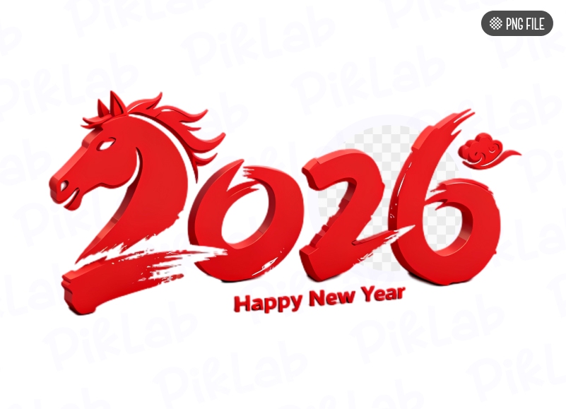 3D Happy New Year 2026 typography with powerful red horse head silhouette and brush stroke effect. PNG file, chúc mừng năm mới Bính Ngọ, số 2026 cách điệu linh vật ngựa đỏ, thiết kế Tết