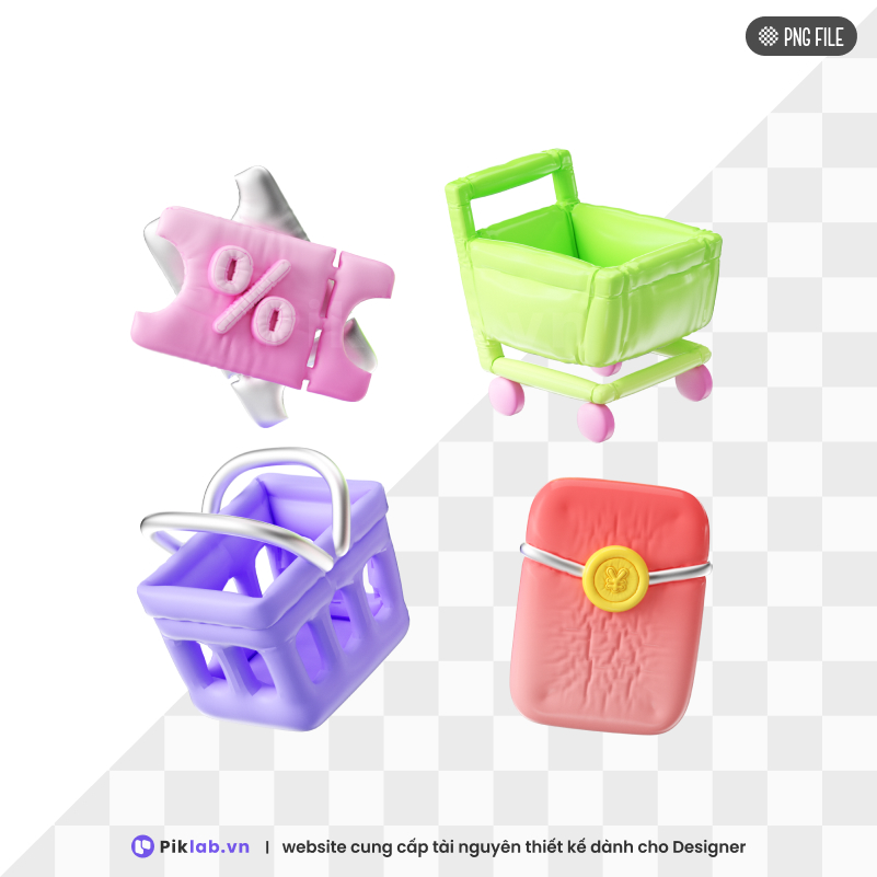 3D Icon Shopping Cart and Coupon Set PNG – Cute E-commerce Icons with Discount Tag and Wallet, biểu tượng giỏ hàng, voucher, ví tiền 3D, PNG file