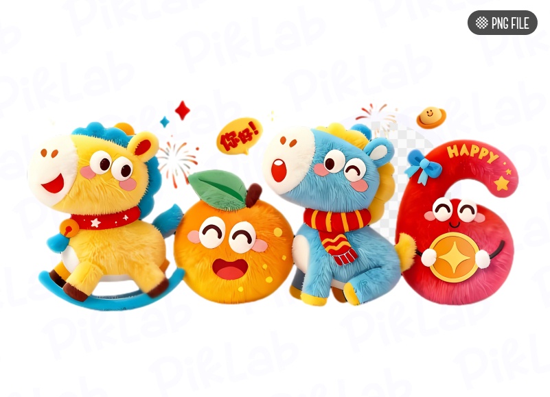 Playful 3D 2026 number set with cute blue horse mascot, orange fruit and happy characters. PNG file, Happy New Year 2026, số 2026 nhân vật vui nhộn, ngựa xanh may mắn và trái quýt ngày Tết