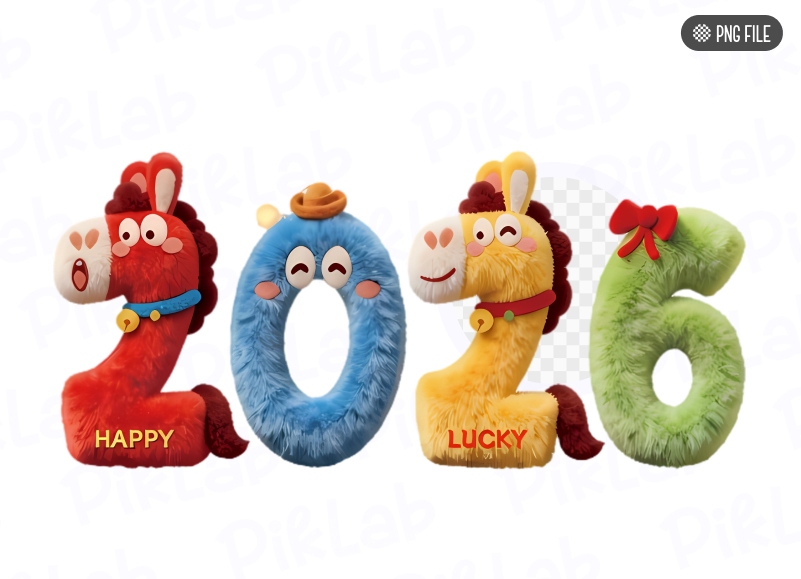 Adorable 3D plush stuffed toy 2026 numbers with colorful horses and happy lucky themes. PNG file, chúc mừng năm mới 2026, số 2026 thú bông linh vật ngựa, trang trí Tết Bính Ngọ