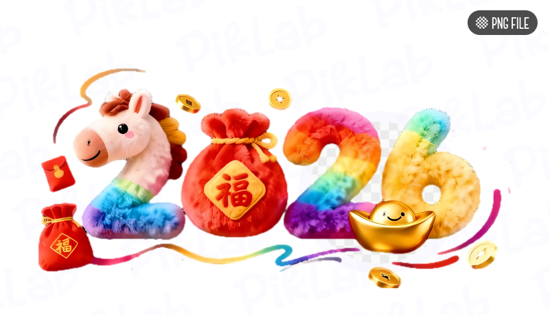 Colorful furry 2026 numbers with cute zodiac horse and lucky red money bag. PNG file, Tet holiday theme, số 2026 lông vũ bảy sắc cầu vồng, ngựa con dễ thương và túi tiền tài lộc