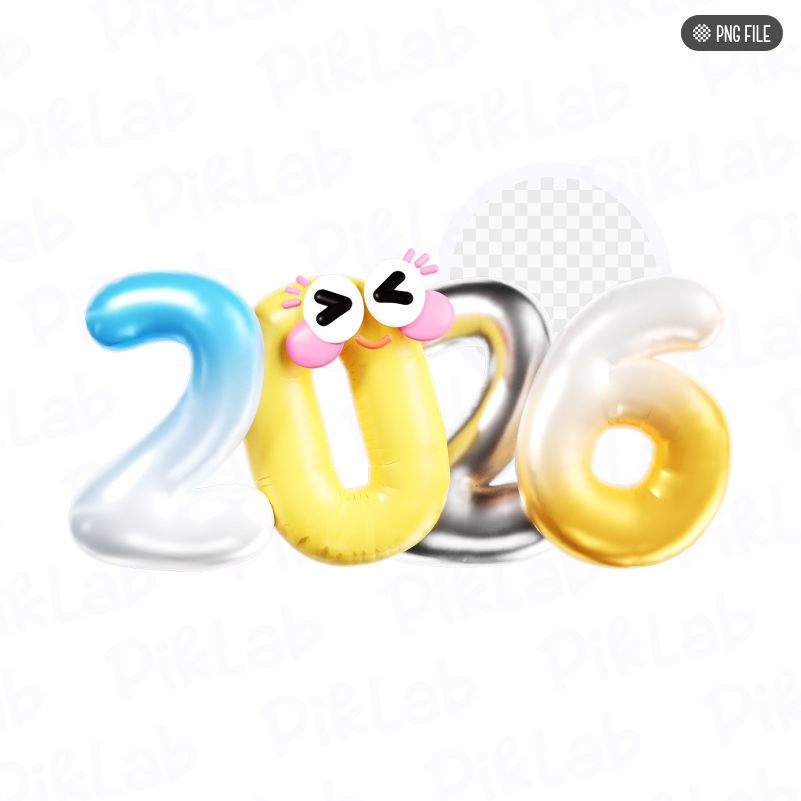 Colorful Glossy 2026 Balloon Numbers with Cute Smiling Face Character. PNG file, Happy New Year 2026, số 2026 bong bóng nghệ thuật, mẫu trang trí chúc mừng năm mới 2026 hiện đại