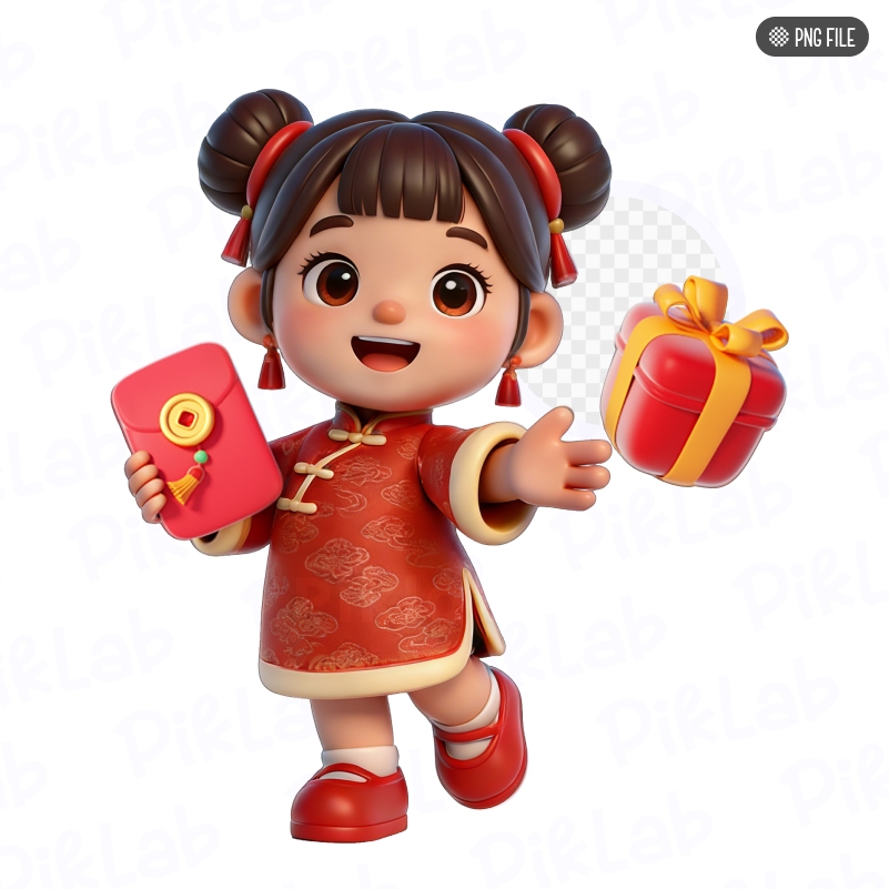Cute 3D little girl character in traditional costume holding a lucky money envelope and gift box. PNG file, Happy New Year 2026, nhân vật bé gái chúc Tết dễ thương, bao lì xì và hộp quà Tết 3D