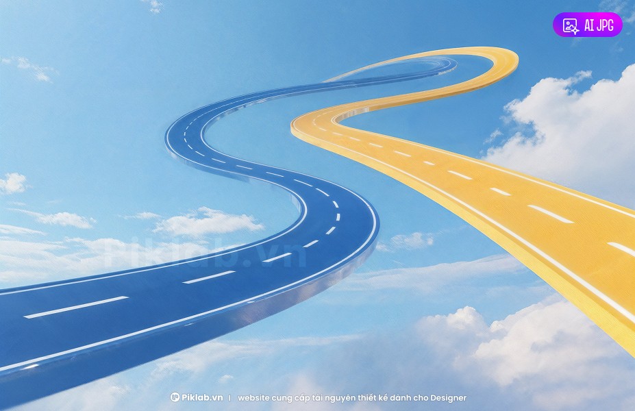 Digital image of a surreal elevated road splitting into two separate paths, one blue and one yellow, winding into a deep blue sky dotted with white clouds. Two roads running parallel, JPG file, AI JPG background, đường cao tốc