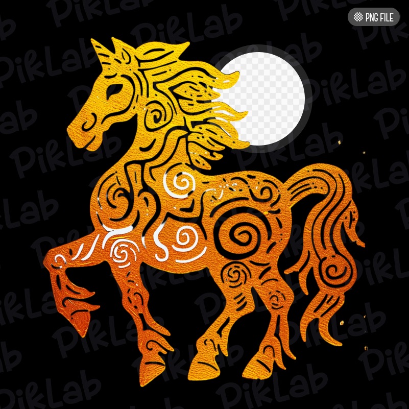 Golden bronze horse with traditional spiral patterns and moon element. PNG file 2026, chúc mừng năm mới, PNG ngựa, Tết Bính Ngọ, ngựa vàng đồng phong thủy