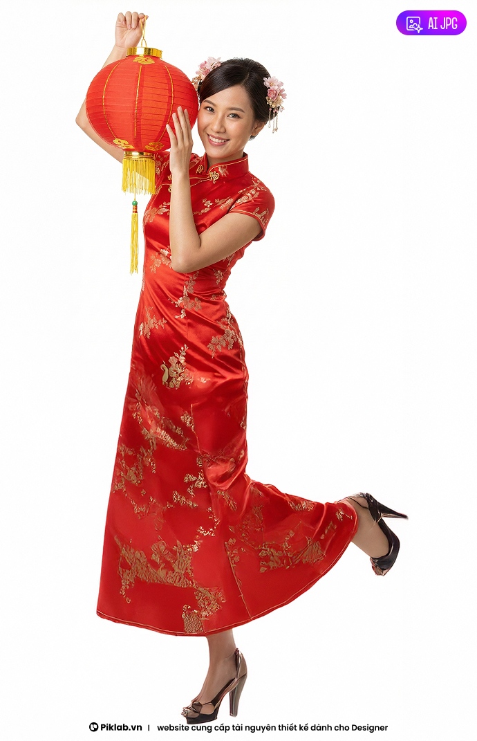 Graceful model posing with a red lantern in traditional dress for Happy Lunar New Year, Người mẫu duyên dáng tạo dáng cùng chiếc đèn lồng đỏ trong trang phục truyền thống nhân dịp Tết Nguyên Đán, JPG file