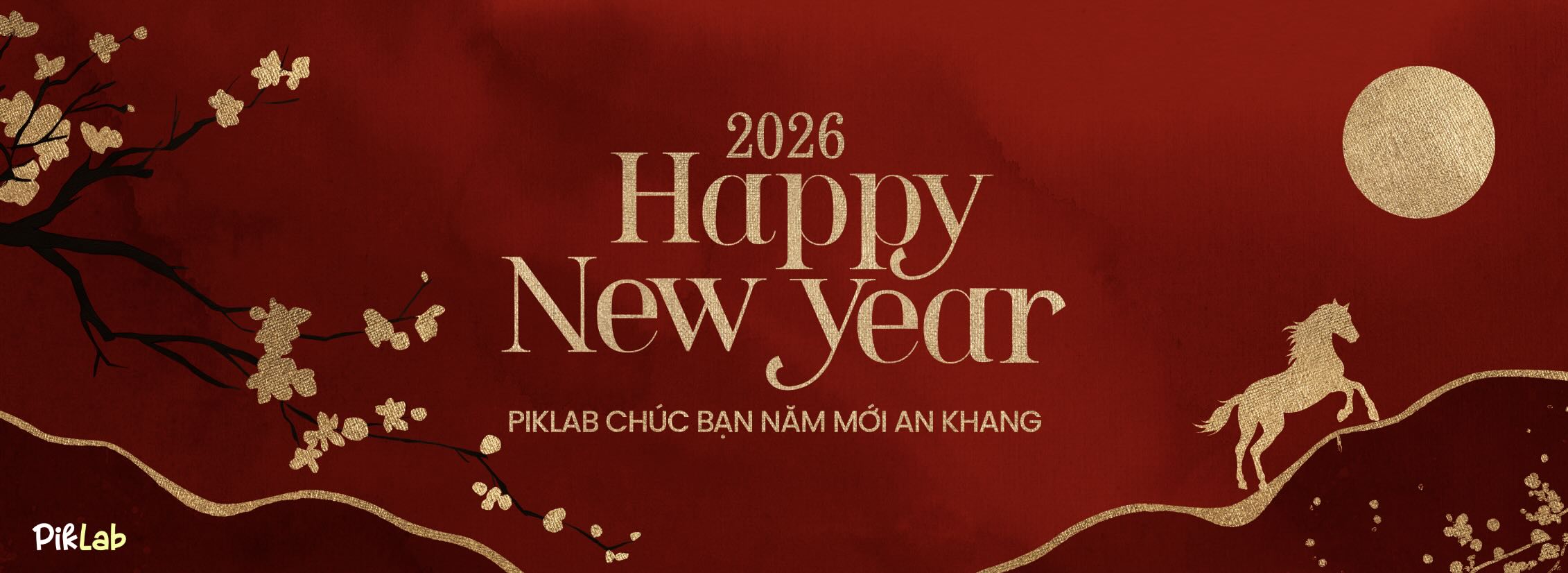 Happy New Year 2026 Red & Gold Lunar New Year Background with Horse Illustration – Luxury Asian New Year Banner - Banner chúc mừng năm mới tone đỏ vàng sang trọng