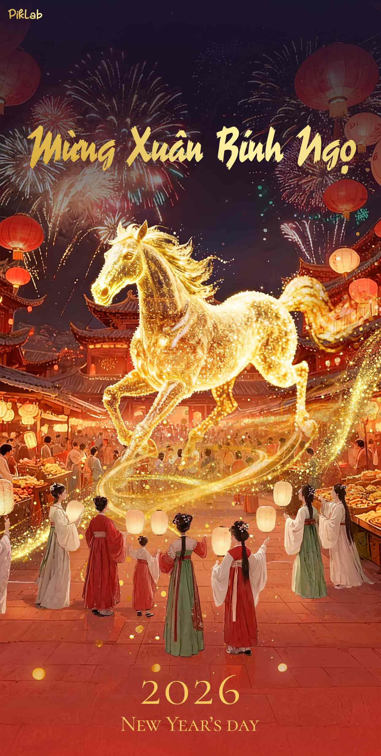 Happy New Year 2026, the Year of the Horse. A divine horse shines brightly in the spring night of the Year of the Fire Horse, Ngựa thần phát sáng rực rỡ giữa đêm xuân, Tết Bính Ngọ 2026