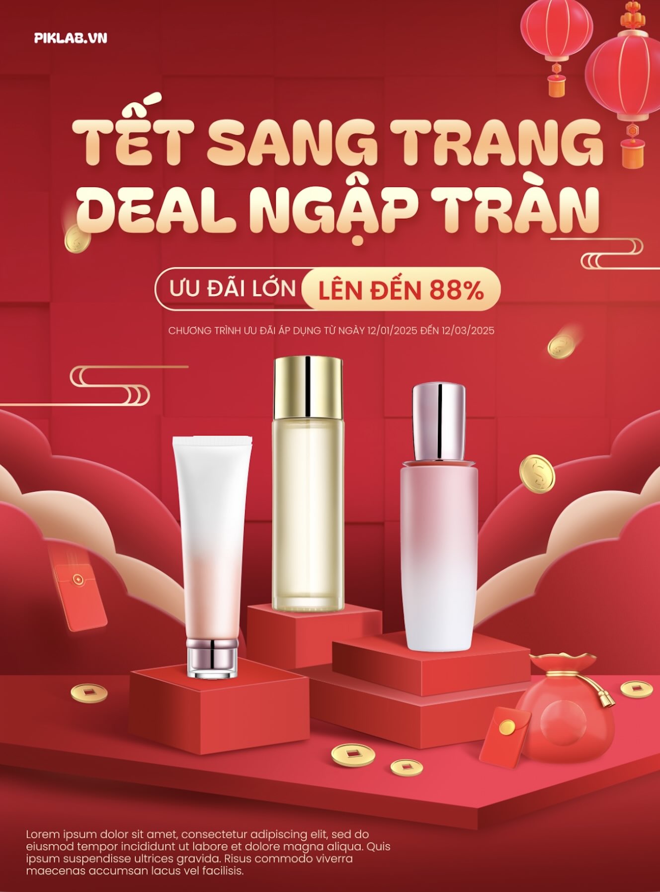 Modern Lunar New Year sale banner for skincare products with red paper-cut clouds and gold coins, New Year sale banner, ưu đãi mỹ phẩm Tết, Tết sang trang deal ngập tràn 2026