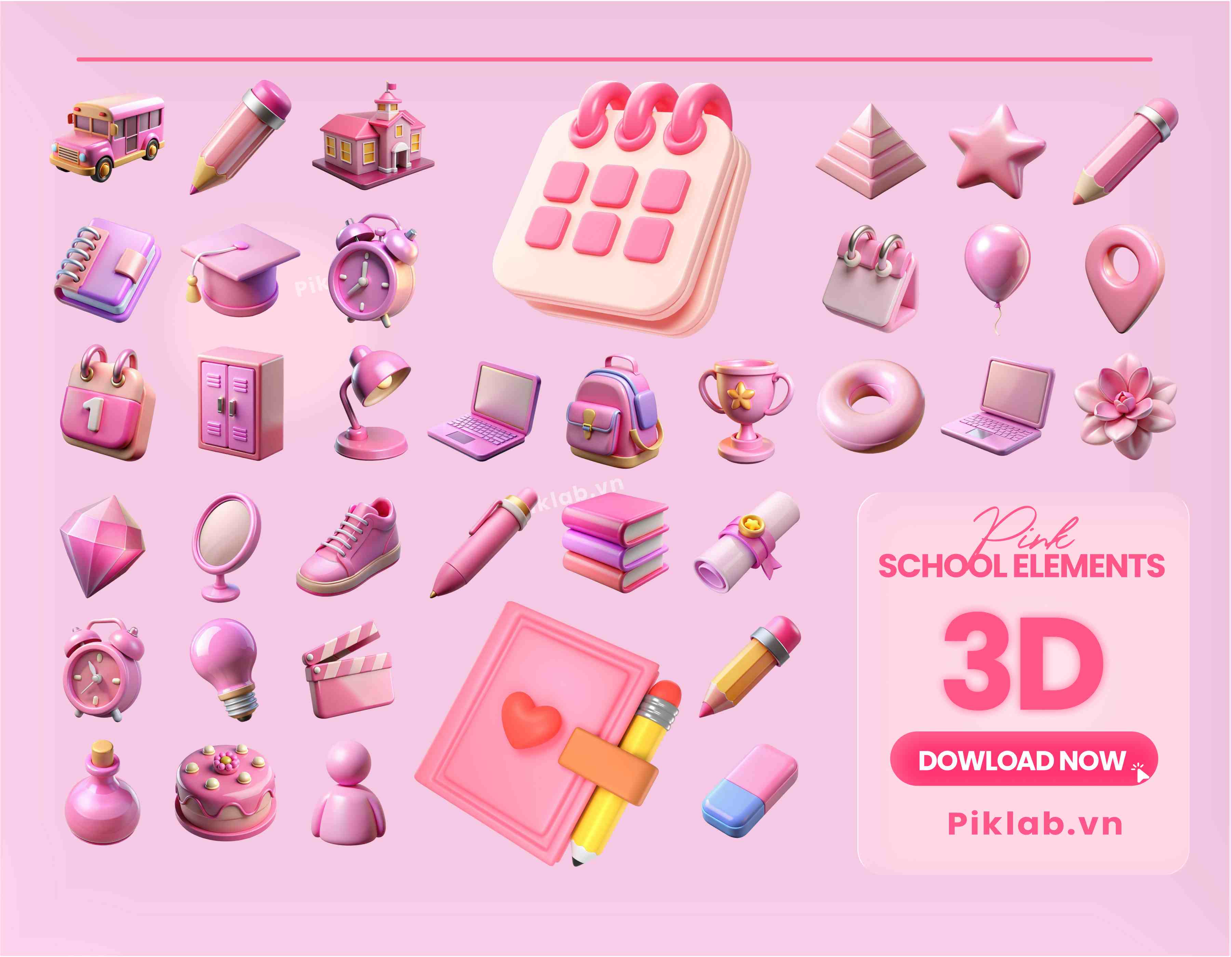 Pack Pink 3D School Elements Icon Set – Cute Education Tools and Stationery Design | Bộ icon trường học 3D tông hồng dễ thương