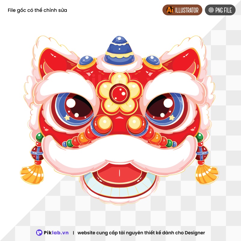 Painting depicts the head of a lion in a traditional dance. It has thick white eyebrows and whiskers, large, sparkling round eyes with star-shaped patterns, PNG file, đầu lân truyền thống, PNG tết, chúc mừng năm mới