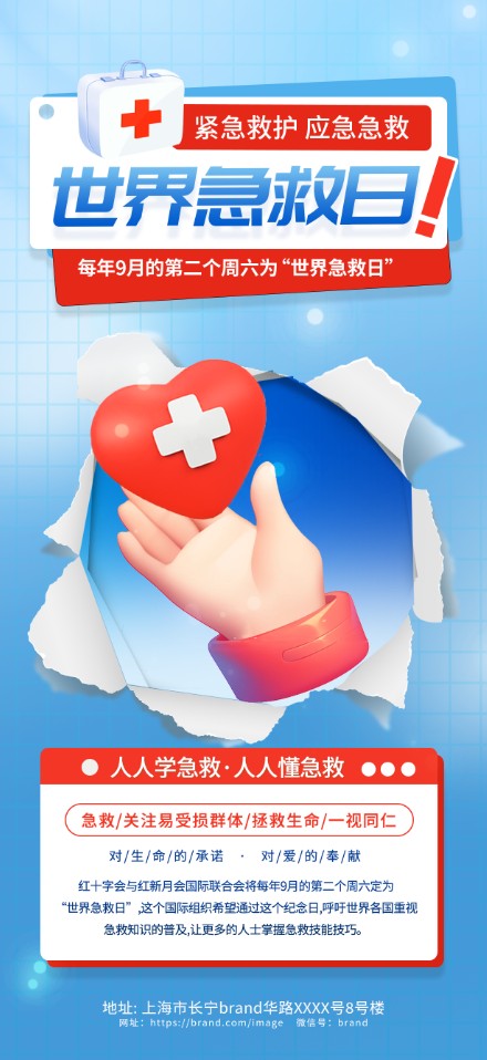 Poster promotes World First Aid Day, emphasizing the importance of emergency rescue and first aid knowledge. It features a hand holding a heart with a medical cross, poster ngày sơ cứu thế giới