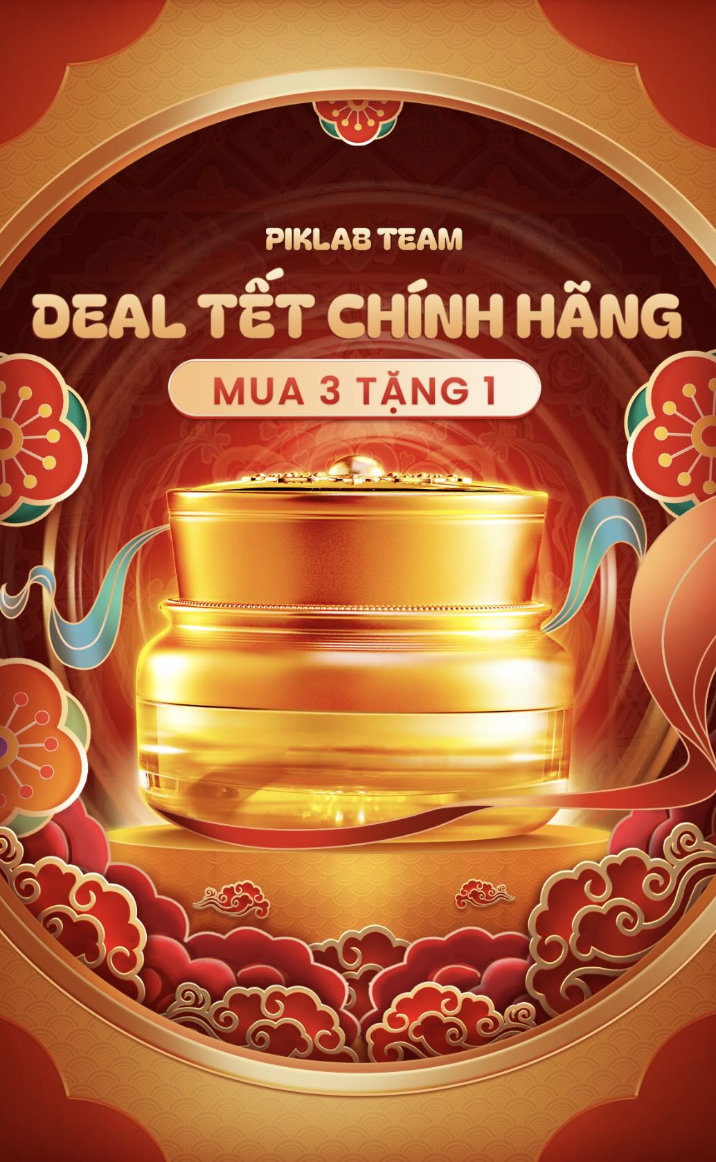 Royal oriental style cosmetics banner with golden frame and traditional peony flower patterns, New Year sale banner, deal Tết chính hãng, mua 3 tặng 1 mỹ phẩm Tết Bính Ngọ