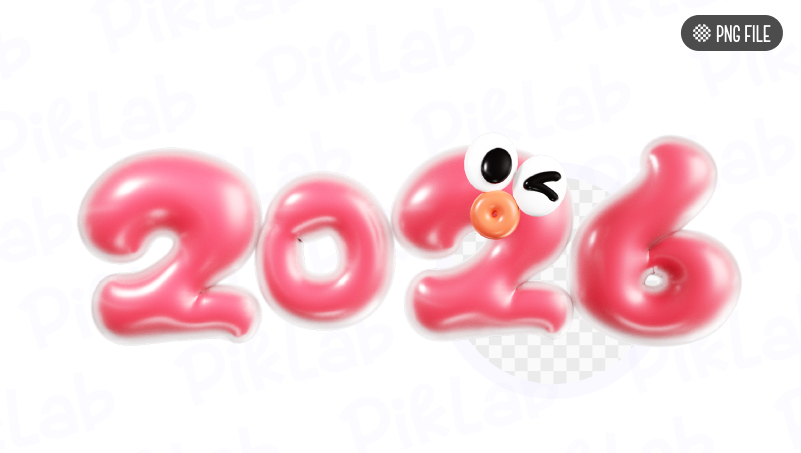 Sweet Pink 3D Balloon 2026 Numbers with Winking Emoji Face Character. PNG file, Happy New Year 2026, số 2026 màu hồng dễ thương, mẫu thiết kế lời chúc năm mới 2026 trẻ trung