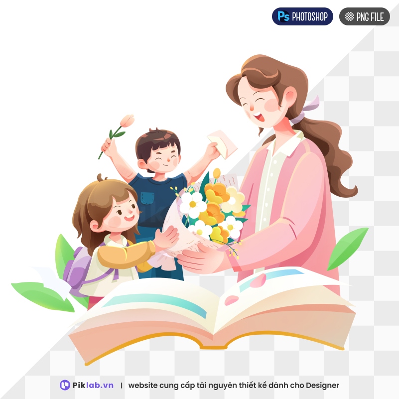 Teacher and Students Illustration PNG – Kids Giving Flowers and Cards to Teacher on Open Book, hình ảnh giáo viên và học sinh, tặng hoa, PNG file