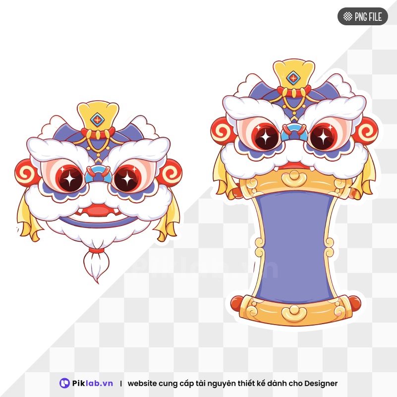 Two paintings illustrate stylized dancing lion heads in blue and orange; one symbolizes independence, and the other holds a tall scroll of red paper in its beak. PNG file, chúc mừng năm mới, PNG tết, đầu lân múa truyền thống