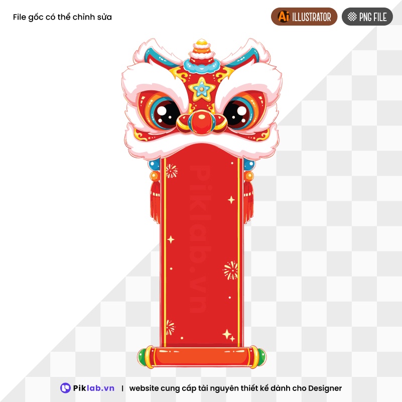 Vivid illustration of a traditional dancing lion's head is placed on a vertical red scroll used to celebrate the Lunar New Year. Đầu lân truyền thống ngậm cuộn giấy đỏ, PNG file, chúc mừng năm mới, PNG tết