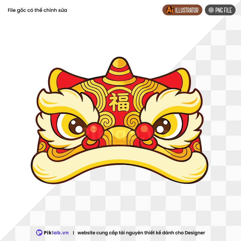 Vivid illustration of a traditional red and gold lion dance head with the character "Fu" (blessing) on its forehead. PNG file, đầu múa lân truyền thống, PNG tết, chúc mừng năm mới
